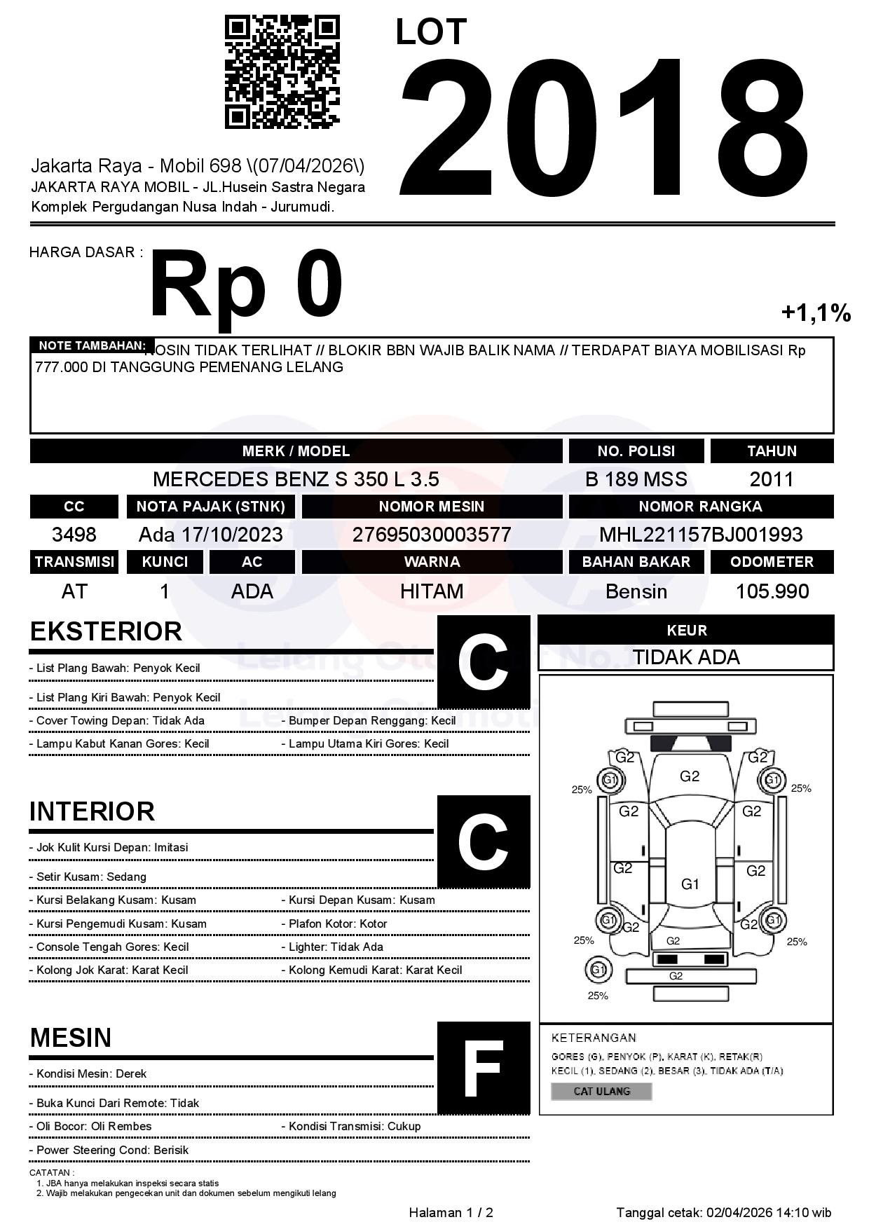 NOSIN TIDAK TERLIHAT // BLOKIR BBN WAJIB BALIK NAMA // TERDAPAT BIAYA MOBILISASI Rp 777.000 DI TANGGUNG PEMENANG LELANG