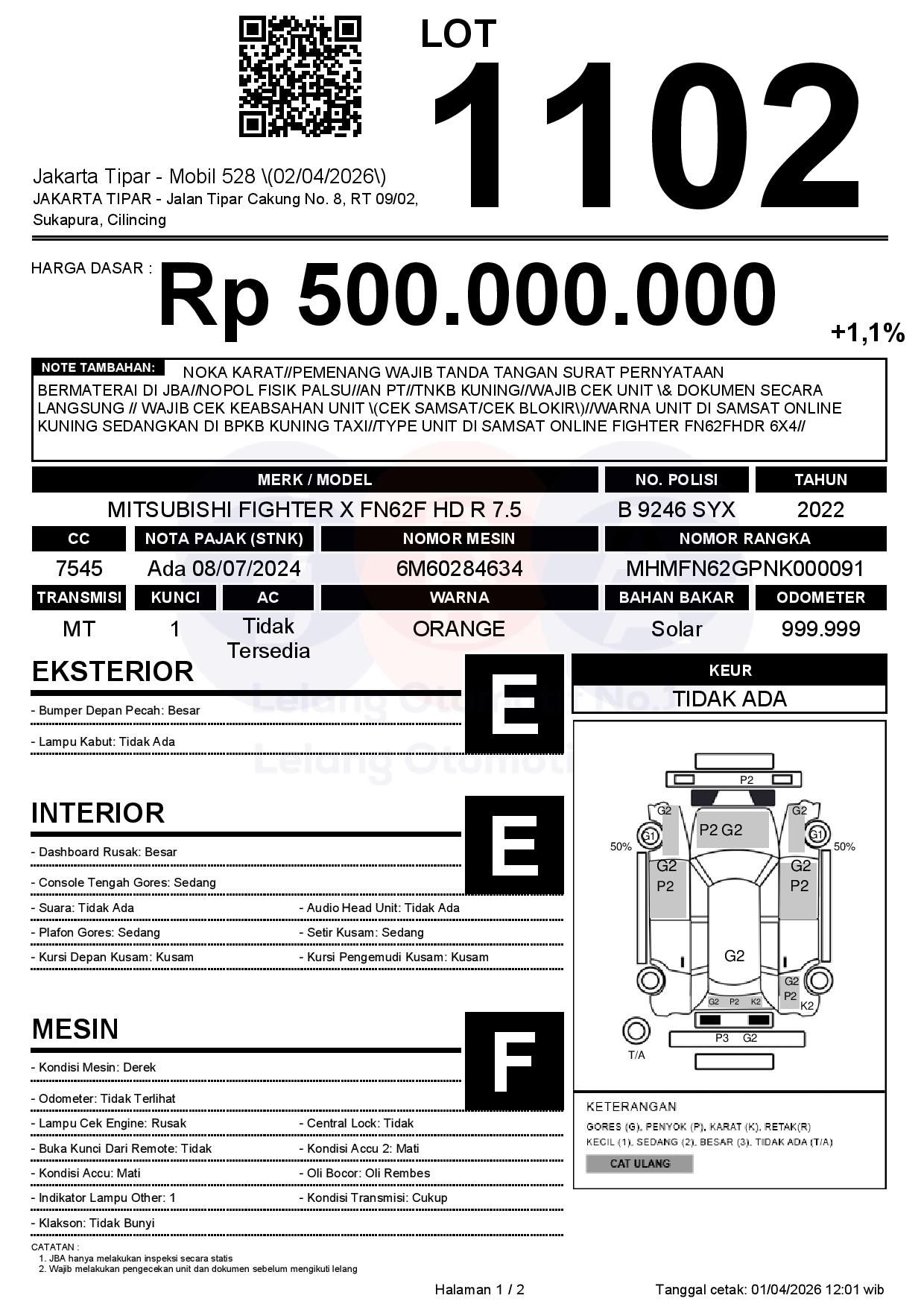 NOKA KARAT//PEMENANG WAJIB TANDA TANGAN SURAT PERNYATAAN BERMATERAI DI JBA//NOPOL FISIK PALSU//AN PT//TNKB KUNING//WAJIB CEK UNIT & DOKUMEN SECARA LANGSUNG // WAJIB CEK KEABSAHAN UNIT (CEK SAMSAT/CEK BLOKIR)//WARNA UNIT DI SAMSAT ONLINE KUNING SEDANGKAN DI BPKB KUNING TAXI//TYPE UNIT DI SAMSAT ONLINE FIGHTER FN62FHDR 6X4//