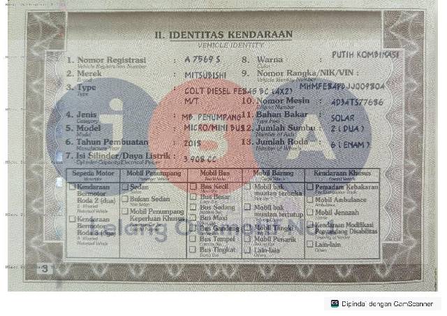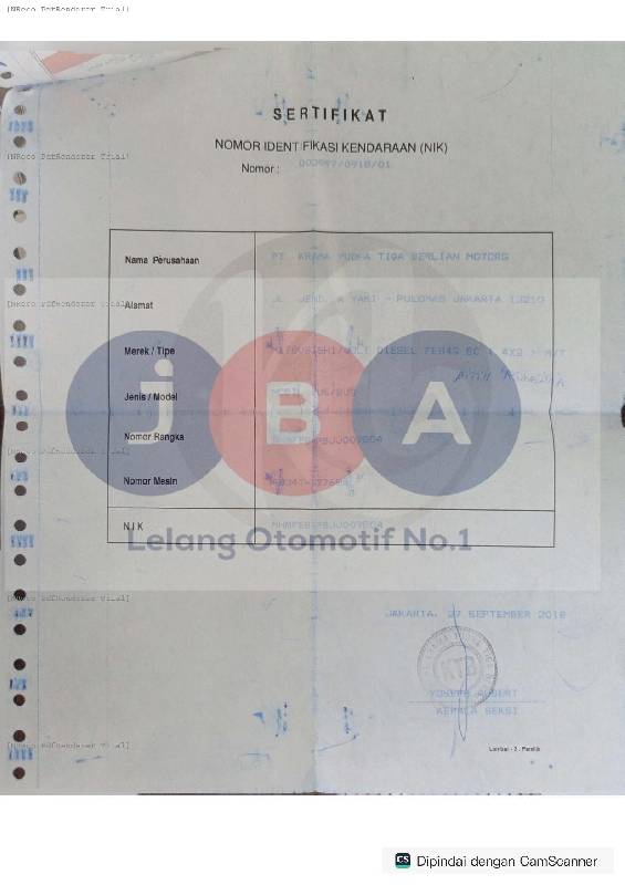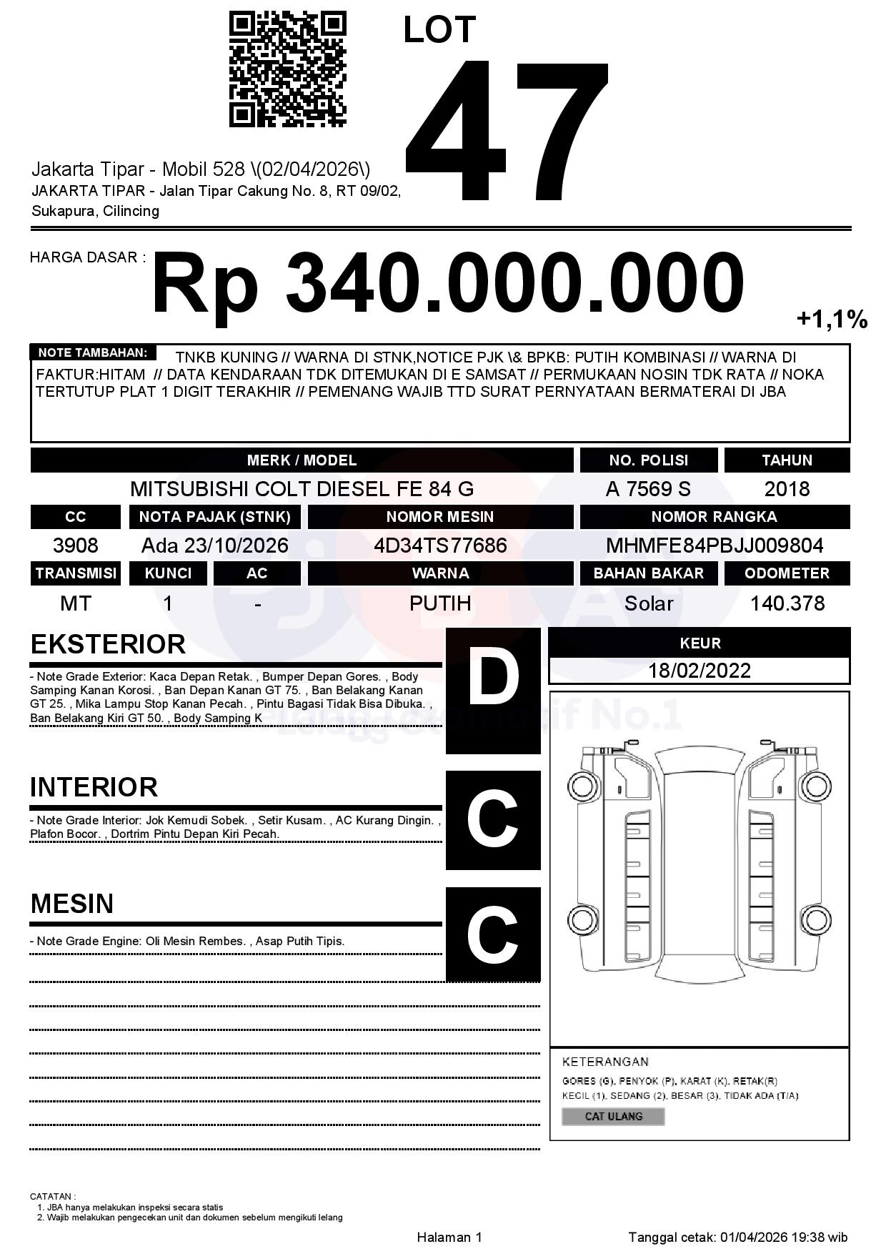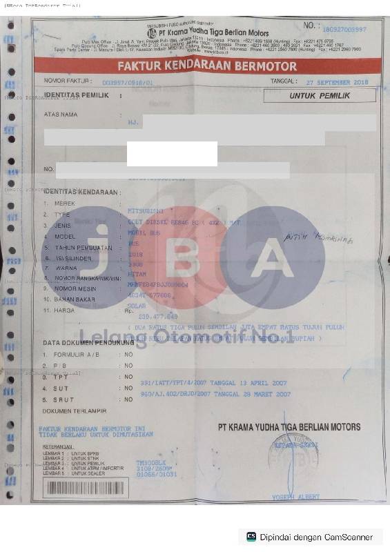 TNKB KUNING // WARNA DI STNK,NOTICE PJK & BPKB: PUTIH KOMBINASI // WARNA DI FAKTUR:HITAM // DATA KENDARAAN TDK DITEMUKAN DI E SAMSAT // PERMUKAAN NOSIN TDK RATA // NOKA TERTUTUP PLAT 1 DIGIT TERAKHIR // PEMENANG WAJIB TTD SURAT PERNYATAAN BERMATERAI DI JBA