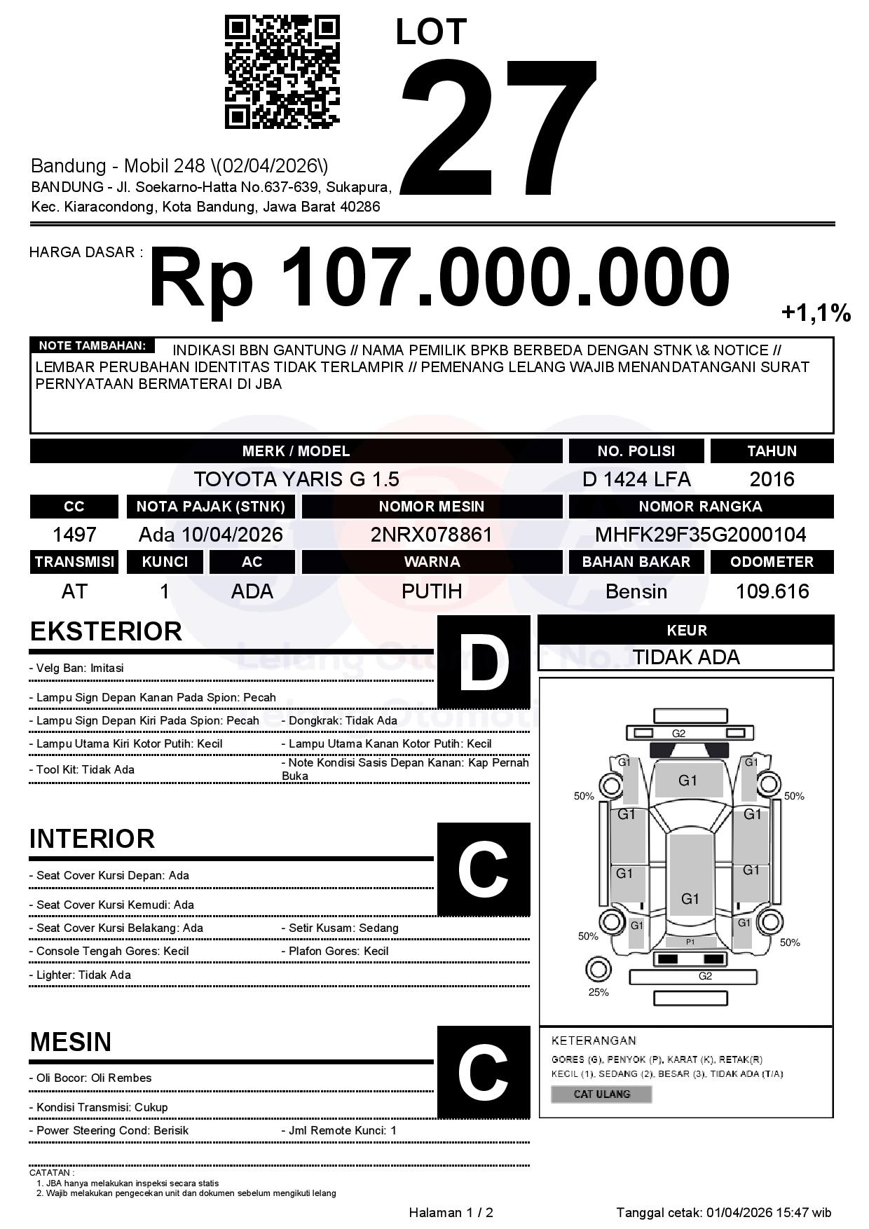 INDIKASI BBN GANTUNG // NAMA PEMILIK BPKB BERBEDA DENGAN STNK & NOTICE // LEMBAR PERUBAHAN IDENTITAS TIDAK TERLAMPIR // PEMENANG LELANG WAJIB MENANDATANGANI SURAT PERNYATAAN BERMATERAI DI JBA