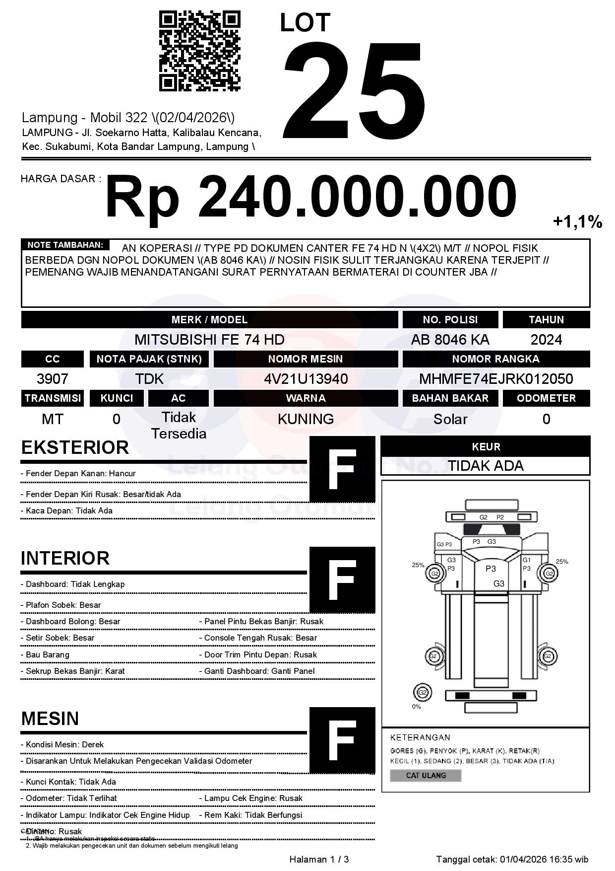AN KOPERASI // TYPE PD DOKUMEN CANTER FE 74 HD N (4X2) M/T // NOPOL FISIK BERBEDA DGN NOPOL DOKUMEN (AB 8046 KA) // NOSIN FISIK SULIT TERJANGKAU KARENA TERJEPIT // PEMENANG WAJIB MENANDATANGANI SURAT PERNYATAAN BERMATERAI DI COUNTER JBA //