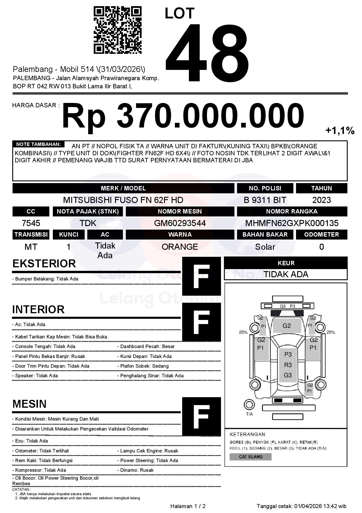 AN PT // NOPOL FISIK TA // WARNA UNIT DI FAKTUR(KUNING TAXI) BPKB(ORANGE KOMBINASI) // TYPE UNIT DI DOK(FIGHTER FN62F HD 6X4) // FOTO NOSIN TDK TERLIHAT 2 DIGIT AWAL&1 DIGIT AKHIR // PEMENANG WAJIB TTD SURAT PERNYATAAN BERMATERAI DI JBA