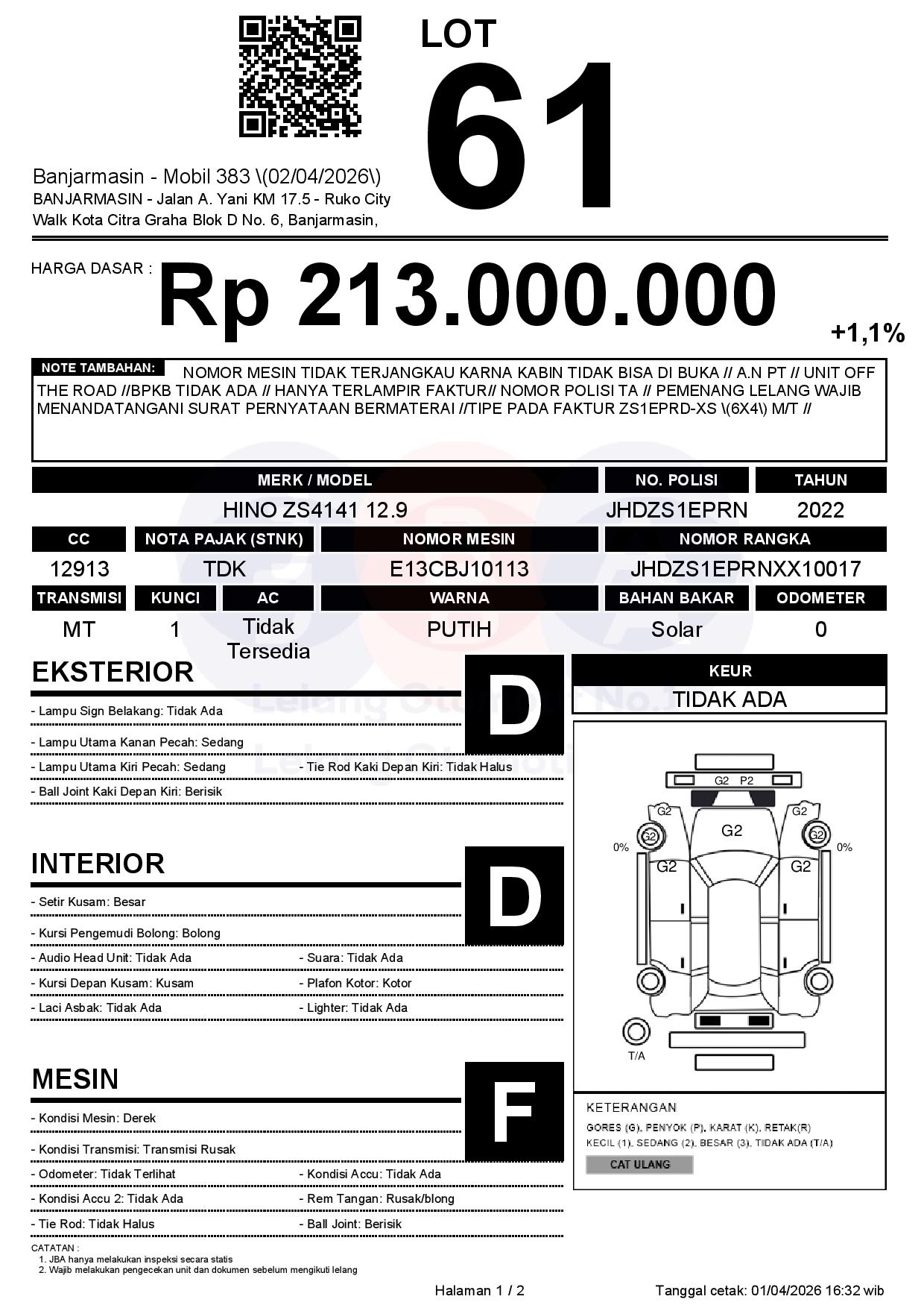NOMOR MESIN TIDAK TERJANGKAU KARNA KABIN TIDAK BISA DI BUKA // A.N PT // UNIT OFF THE ROAD //BPKB TIDAK ADA // HANYA TERLAMPIR FAKTUR// NOMOR POLISI TA // PEMENANG LELANG WAJIB MENANDATANGANI SURAT PERNYATAAN BERMATERAI //TIPE PADA FAKTUR ZS1EPRD-XS (6X4) M/T //