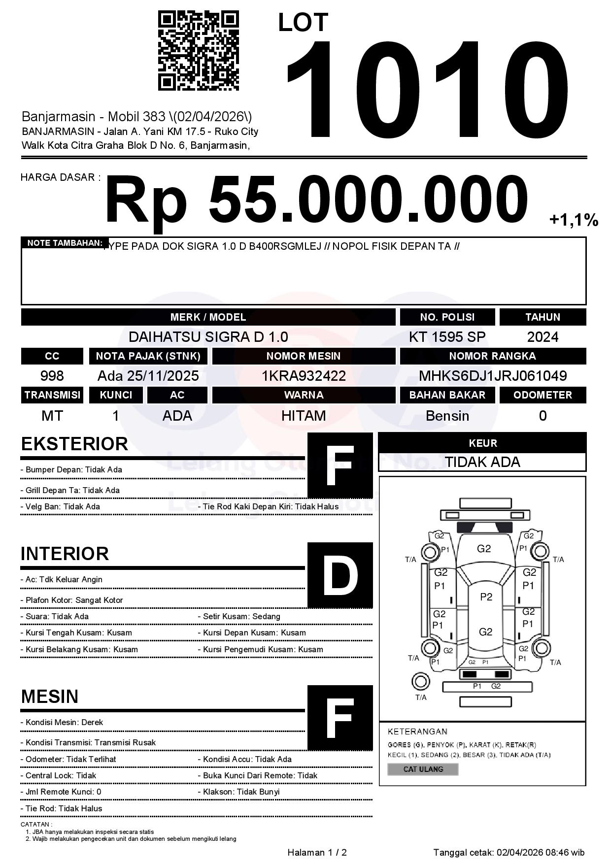 TYPE PADA DOK SIGRA 1.0 D B400RSGMLEJ // NOPOL FISIK DEPAN TA //
