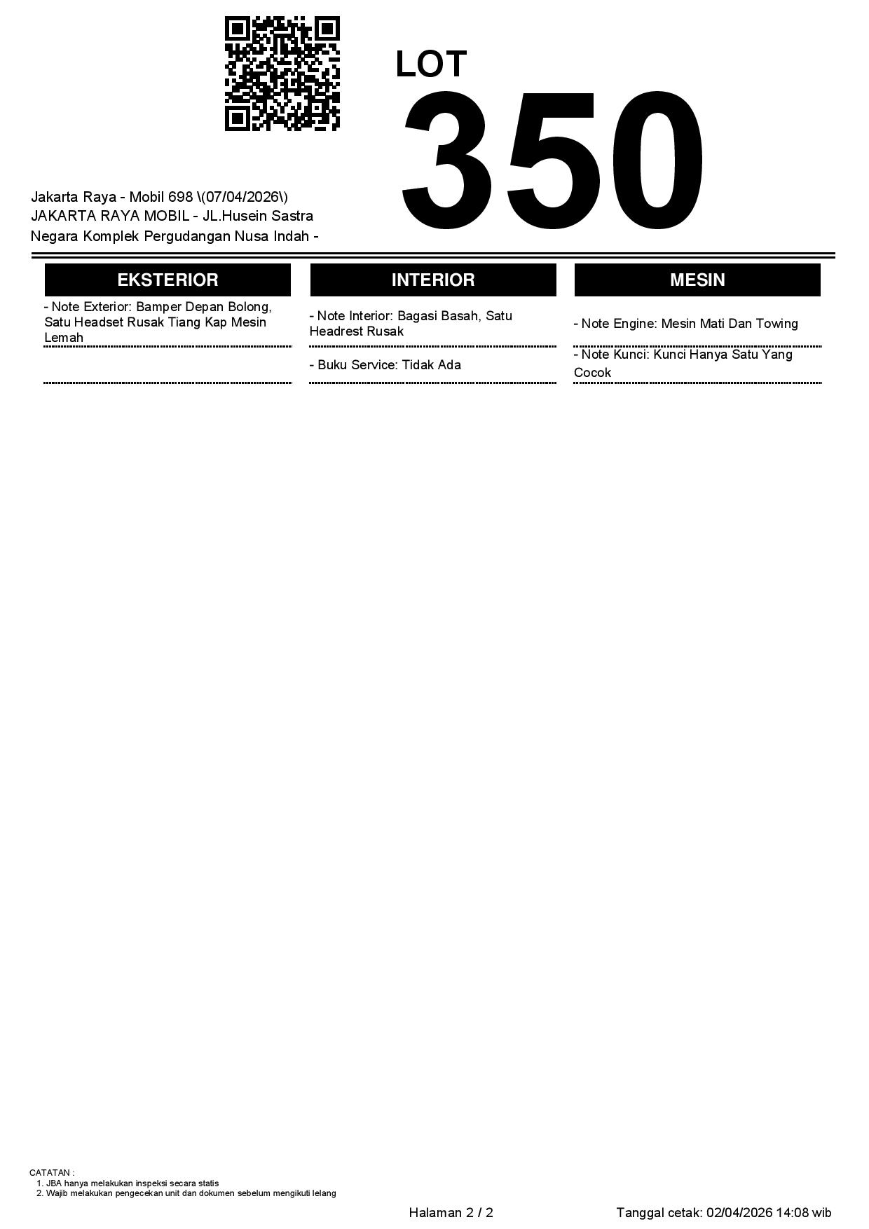 BATAS PELUNASAN 17:00 WIB HARI H LELANG // TERDAPAT BIAYA MOBILISASI Rp700.000 YANG DITANGGUNG PEMENANG LELANG// BLOKIR BBN WAJIB BALIK NAMA // BN DARI LUAR DAERAH // FAKTUR FC // EX BBN //