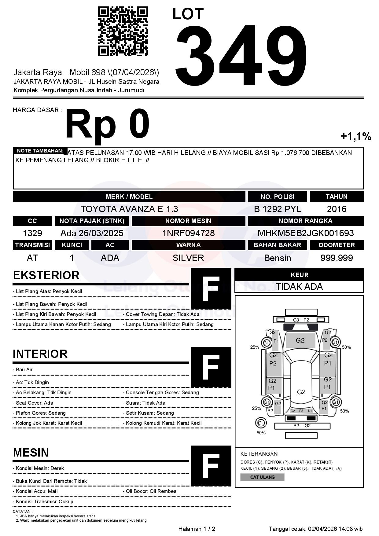 BATAS PELUNASAN 17:00 WIB HARI H LELANG // BIAYA MOBILISASI Rp 1.076.700 DIBEBANKAN KE PEMENANG LELANG // BLOKIR E.T.L.E. //