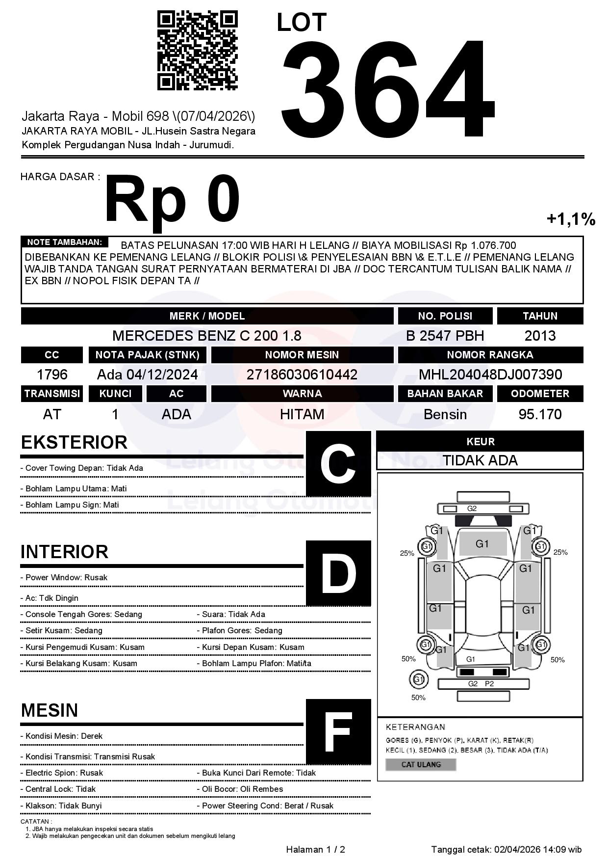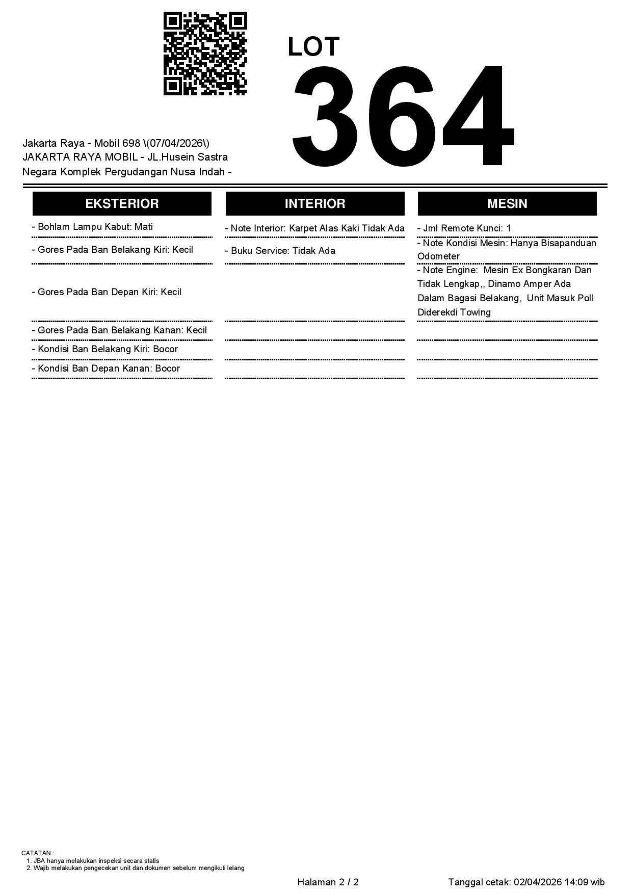 BATAS PELUNASAN 17:00 WIB HARI H LELANG // BIAYA MOBILISASI Rp 1.076.700 DIBEBANKAN KE PEMENANG LELANG // BLOKIR POLISI & PENYELESAIAN BBN & E.T.L.E // PEMENANG LELANG WAJIB TANDA TANGAN SURAT PERNYATAAN BERMATERAI DI JBA // DOC TERCANTUM TULISAN BALIK NAMA // EX BBN // NOPOL FISIK DEPAN TA //