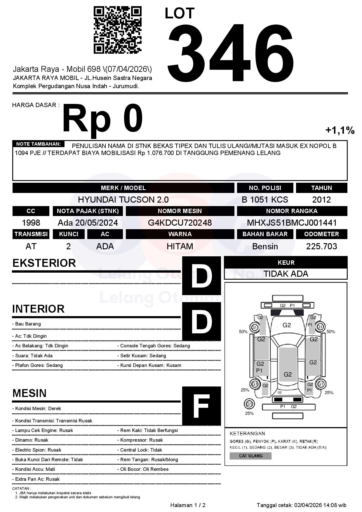 PENULISAN NAMA DI STNK BEKAS TIPEX DAN TULIS ULANG//MUTASI MASUK EX NOPOL B 1094 PJE // TERDAPAT BIAYA MOBILISASI Rp 1.076.700 DI TANGGUNG PEMENANG LELANG
