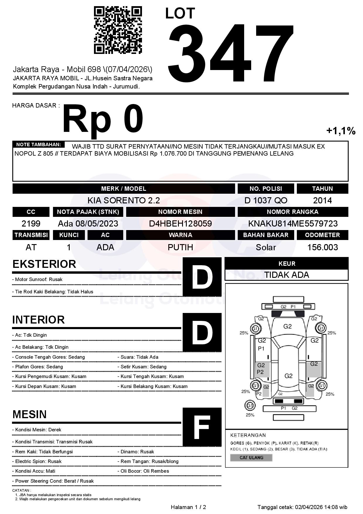 WAJIB TTD SURAT PERNYATAAN//NO MESIN TIDAK TERJANGKAU//MUTASI MASUK EX NOPOL Z 805 // TERDAPAT BIAYA MOBILISASI Rp 1.076.700 DI TANGGUNG PEMENANG LELANG