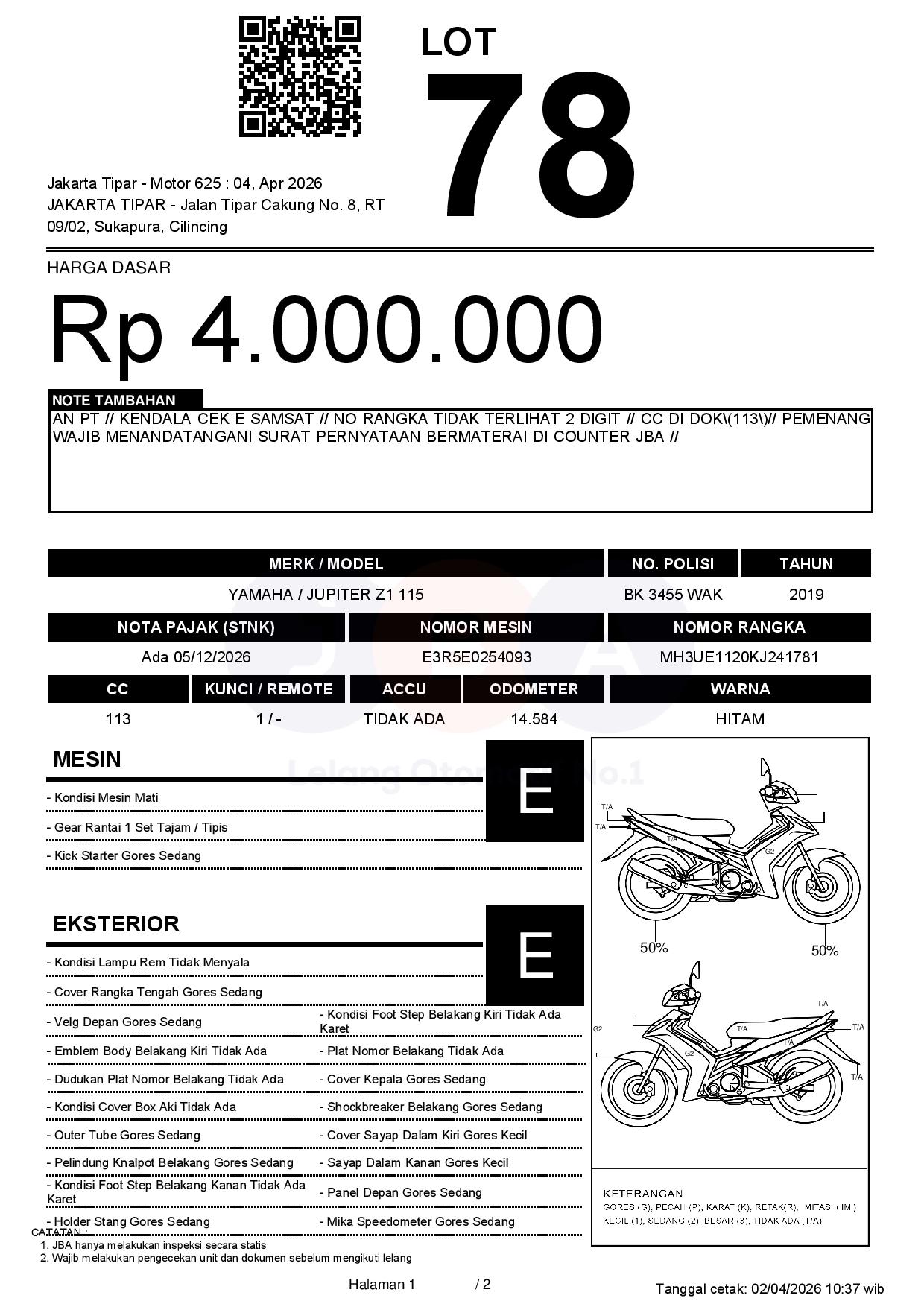 AN PT // KENDALA CEK E SAMSAT // NO RANGKA TIDAK TERLIHAT 2 DIGIT // CC DI DOK(113)// PEMENANG WAJIB MENANDATANGANI SURAT PERNYATAAN BERMATERAI DI COUNTER JBA //
