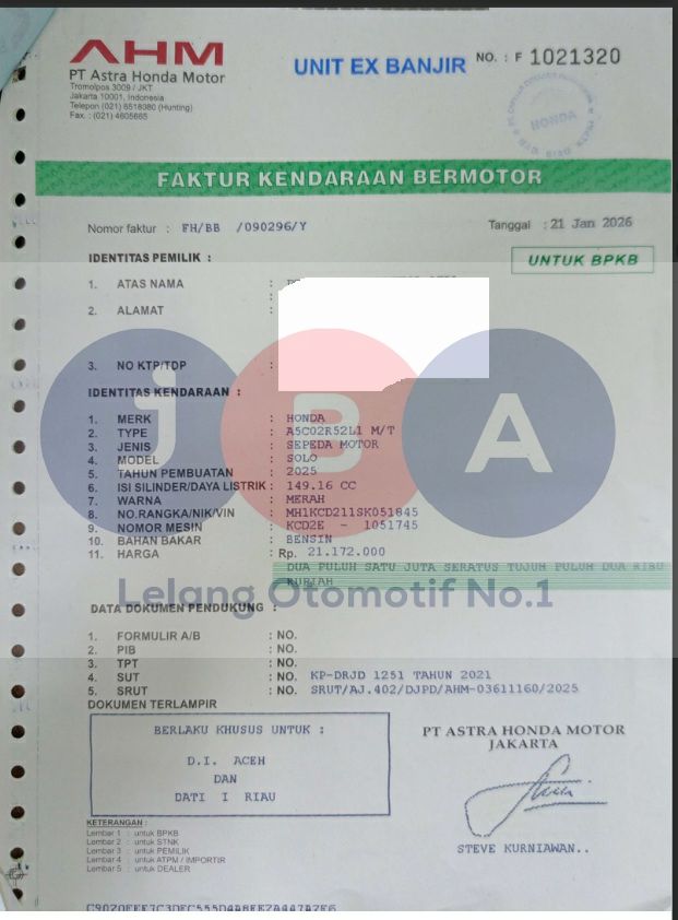 UNIT OTR // DOKUMEN BPKB TA HANYA FAKTUR KENDARAAN// FAKTUR MENYUSUL // SEGALA KEPENGURUSAN PENERBITAN BPKB STNK MENJADI TANGGUNG JAWAB PEMENANG LELANG// A.N PT // LEMBAR FAKTUR TERTERA UNIT EX BANJIR // PADA FAKTUR TERDAPAT KETERANGAN BERLAKU KHUSUS DAERAH ACEH DAN RIAU // PEMENANG WAJIB TTD SURAT PERNYATAAN BERMATERAI DI JBA