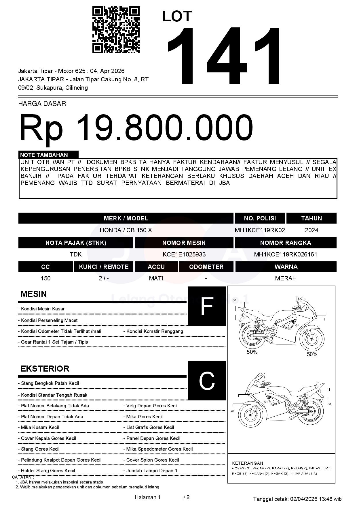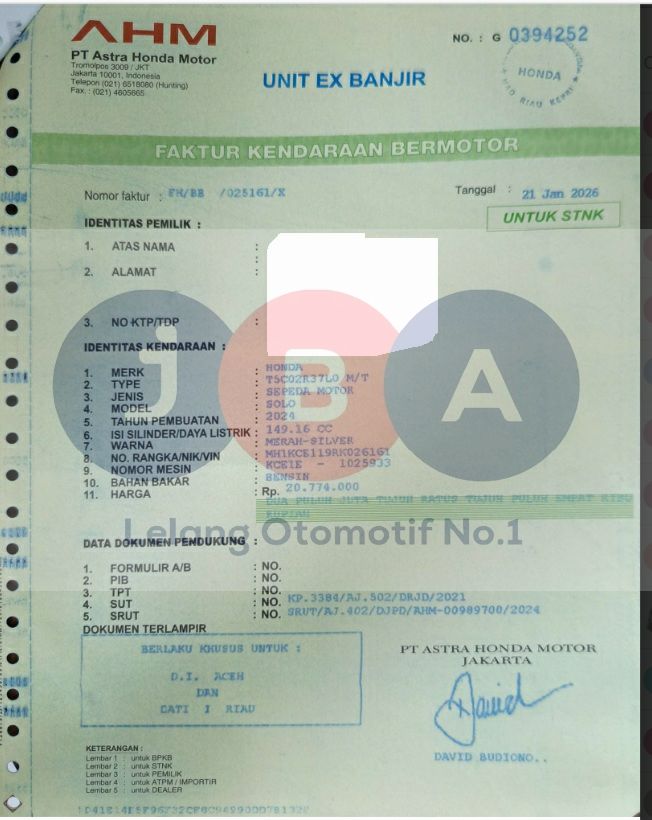UNIT OTR //AN PT // DOKUMEN BPKB TA HANYA FAKTUR KENDARAAN// FAKTUR MENYUSUL // SEGALA KEPENGURUSAN PENERBITAN BPKB STNK MENJADI TANGGUNG JAWAB PEMENANG LELANG // UNIT EX BANJIR // PADA FAKTUR TERDAPAT KETERANGAN BERLAKU KHUSUS DAERAH ACEH DAN RIAU // PEMENANG WAJIB TTD SURAT PERNYATAAN BERMATERAI DI JBA