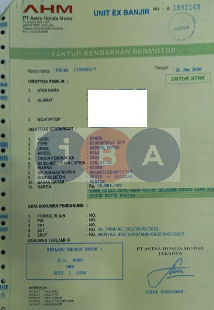 AN PT // UNIT OTR // BPKB TA // HANYA FAKTUR // FAKTUR MENYUSUL // SEGALA KEPENGURUSAN PENERBITAN BPKB STNK MENJADI TANGGUNG JAWAB PEMENANG LELANG // PEMENANG LELANG WAJIB MENANDATANGANI SURAT PERNYATAAN BERMATERAI // FAKTUR TERDAPAT KET EX BANJIR // NOPOL FISIK TA // PADA FAKTUR TERDAPAT KETERANGAN BERLAKU KHUSUS DAERAH ACEH DAN RIAU //