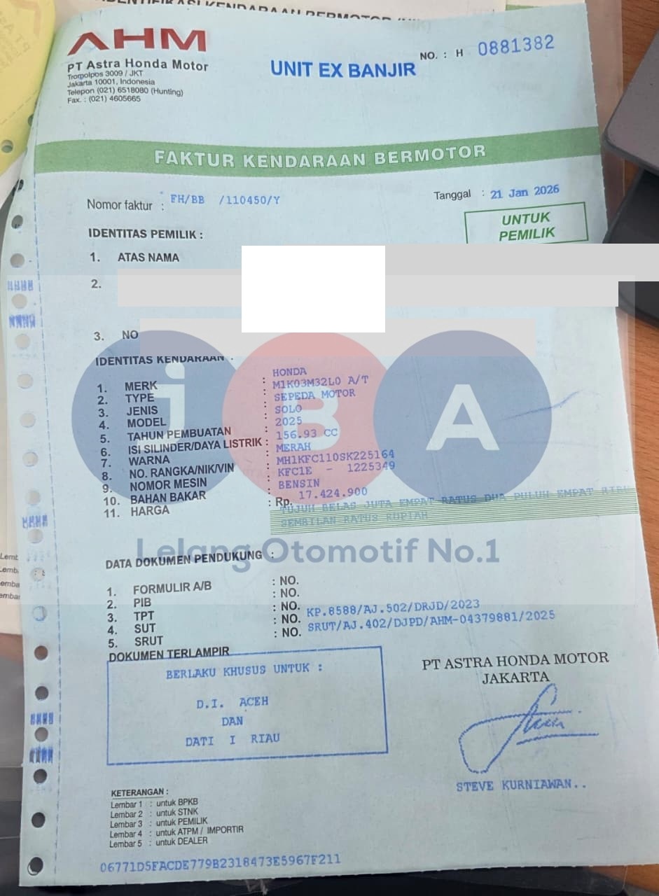 UNIT OTR // DOKUMEN BPKB TA HANYA FAKTUR KENDARAAN// FAKTUR MENYUSUL // SEGALA KEPENGURUSAN PENERBITAN BPKB STNK MENJADI TANGGUNG JAWAB PEMENANG LELANG// A.N PT // LEMBAR FAKTUR TERTERA UNIT EX BANJIR // PADA FAKTUR TERDAPAT KETERANGAN BERLAKU KHUSUS DAERAH ACEH DAN RIAU // PEMENANG WAJIB TTD SURAT PERNYATAAN BERMATERAI DI JBA
