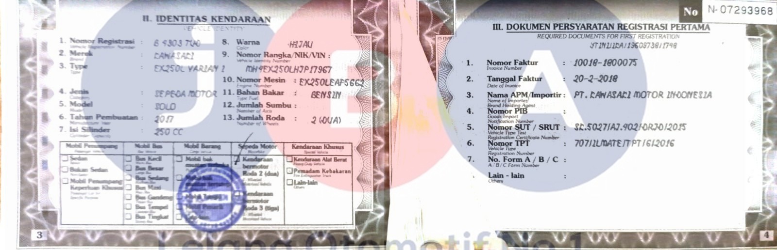 CC SESUAI DENGAN YANG ADA DI STNK // NOPOL BLOKIR ETLE // TIPE PADA DOK EX250L VARIAN I //